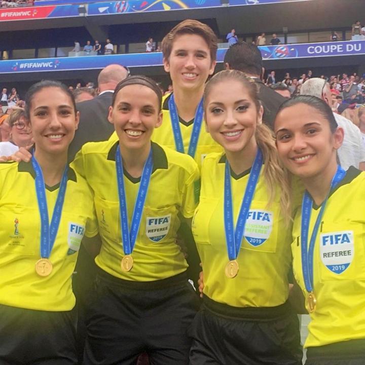 (镜头切入采访现场,女裁判曼努埃拉·尼科洛西端坐桌前,背景是足球赛事海报)